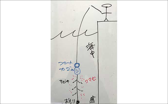 仕掛け全体図(提供:TSURINEWSライター・海無県民masaya)海底では、フロートによって仕掛けが狙った沖の海底で立ってまきエサが出ている状態になります。そうしたらラインは張らず緩めずのハーフテンションにして仕掛けも立ちつつ、アタリも感じられる状態をつくり、アタリが無ければ大きく煽って誘いを入れます。この辺りは足元サビキと同じです。