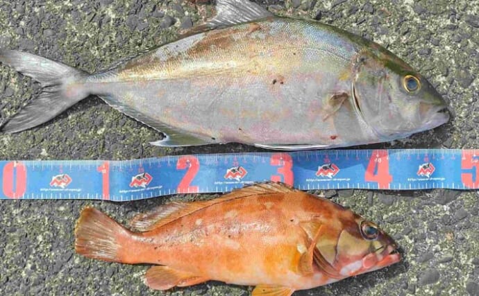 30cm級アカハタ(提供:週刊つりニュース関東版・早田年秀)さらに、ジグのシャクリを繰り返していると、竿が大きく弧を描く。上がってきたのは50cmカンパチ。