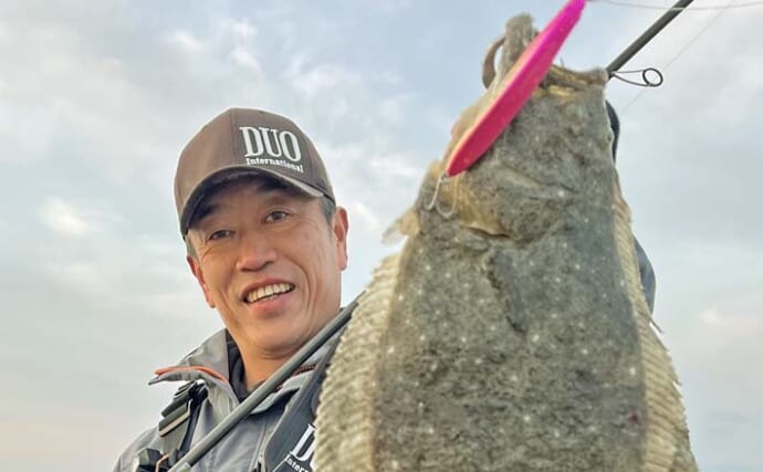 全く予想していなかったのでアワセを決められず、ロッドを落としてしまいそうになった。だがロッドを立ててみると、しっかりフッキングしているようで、波間にグッドサイズのヒラメが見えた。