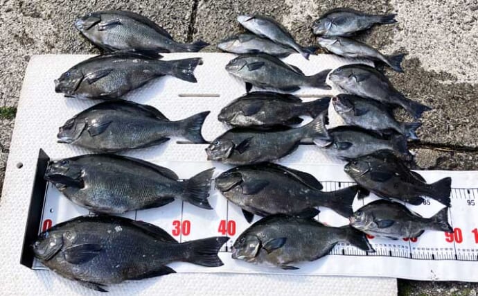 良型の口太をゲット(提供:週刊つりニュース中部版APC・神田浩伸)今回は食ってくるタナや場所を早く見つけ出したのが、釣果につながったと思う。潮の流れでまきエサがたまる場所、たまっているであろうと予測できる場所を考えながら楽しむグレ釣りは奥深いと思う。