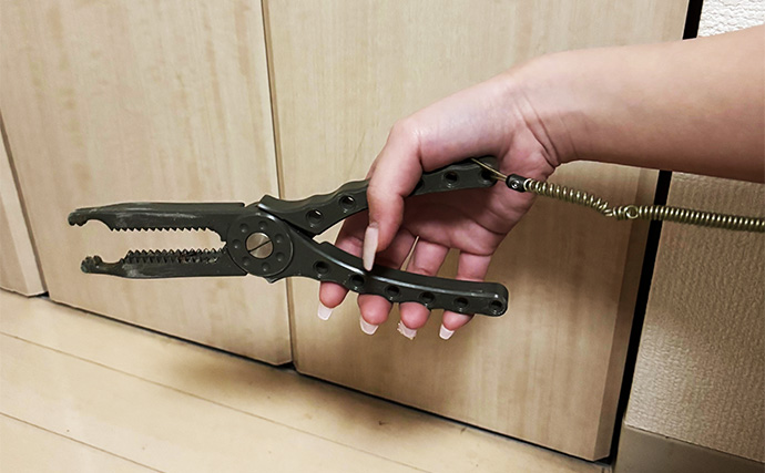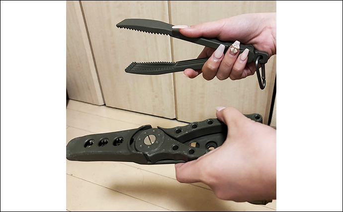 なるほど確かにそうである。つかむ魚のサイズにもよるだろう。続けて、こちらも筆者所有、サブタックルに忍ばせているトングタイプのグリップを持ってもらった。