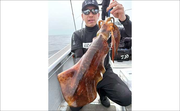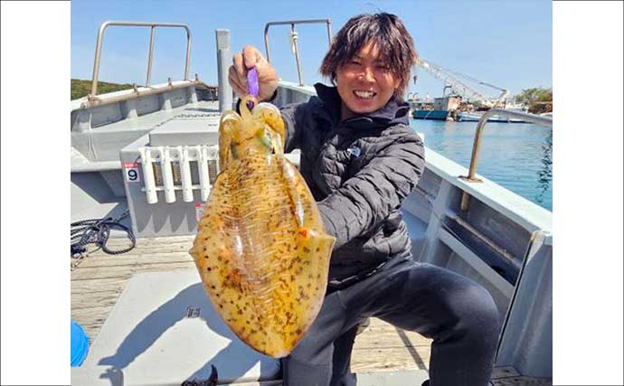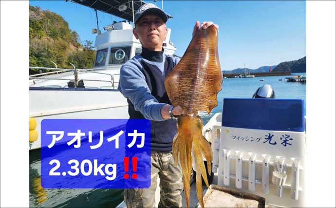 三重県・紀北町三浦のフィッシング光栄で、春の巨大アオリイカが降臨。4日坂口さんが仕留めたのは2.3kgのビッグワン。今後はさらなる大型にも期待だ。シロアマダイも好調。5日には奥山さんらがシロアマダイ10匹にヒラメ、イトヨリなどを上げている。