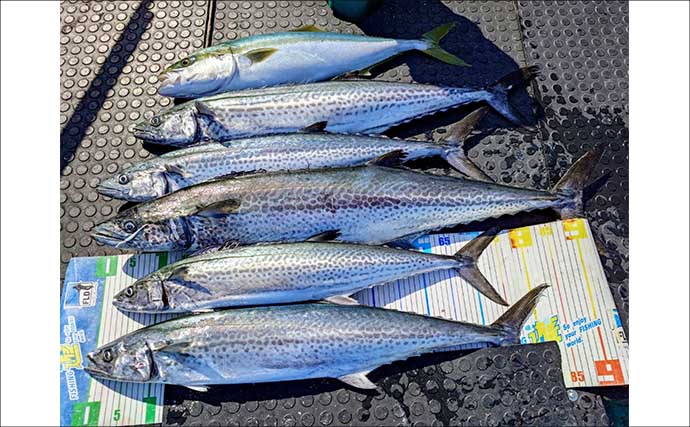 三重県鳥羽市の石鏡漁港から出船しているフィッシュハンターでは、8日にサワラ狙い&トンジギで出船。釣果はサワラ10匹のほか、トンジギでビンナガ2匹をゲット。また、3日はサワラ狙いで出船。メーター級を頭に本命5匹とワラサの釣果だった。