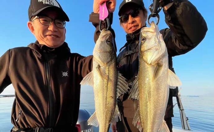 愛知県からオフショアルアーの最新釣果情報が入った。シーバス狙いでは無限ボイルもあり60cm超えが多数ヒット。ほか好調のシオ狙いでも連鎖ヒットが望める。