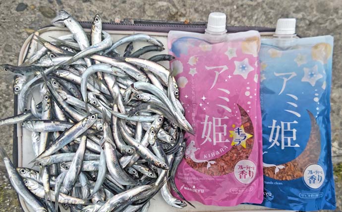 再開すると、同じ魚がまたアタってヘトヘトになる。ふと足下に撒いたコマセを見ると、イワシが寄っている。土産にちょうどいいので、クロダイ狙いを一時中断。サビキ仕掛けと、常温保存が可能なアミ姫で狙ってみる。