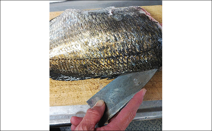 持ち帰った魚は、頭とワタを取り除き、腹側をきれいに水洗いする。血合いの部分は、包丁の先を使ってしっかりこそげ取ろう。このひと手間で、仕上がりの味に差が出る。