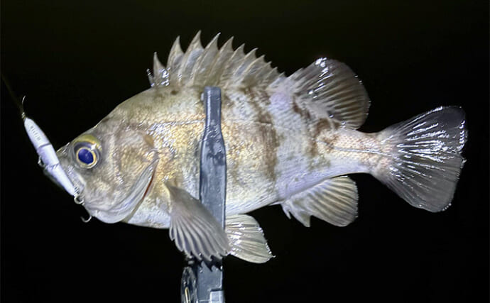 プラグでメバルを手中(提供:TSURINEWSライター・井上海生)まずは1尾が顔出ししてくれる。「そろそろかな」と思い始めてから早い時間にきたので、こちらも気が楽になる。