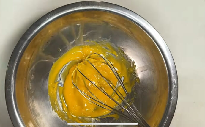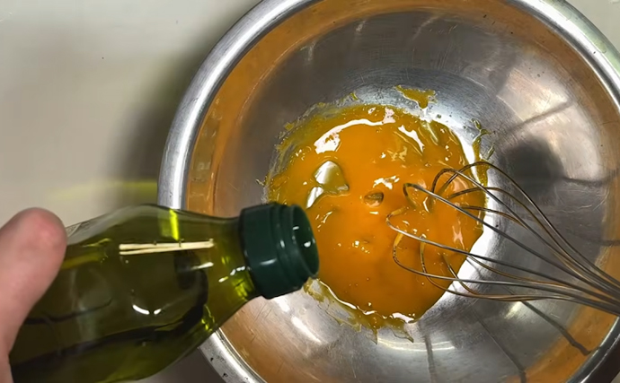ルイユと普通のマヨネーズは、酢が入るか入らないかという違いこそありますが、ベースである「オイルを塩と卵黄と混ぜて乳化させる」という点は共通しています。あらかじめ卵黄とふたつまみほどの塩を混ぜておき、そこにオイルを少々垂らして泡立て器で混ぜると、すぐに卵黄とオイルが混ざりなめらかな黄色のペーストができます。