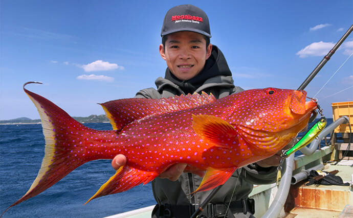 アカハタをキャッチ(提供:TSURINEWSライター・杉浦永)この日、特に効果が高かったのはメガバス「マキッパ」などのブレード系ジグ。アカハタやバラハタが連発でヒット!