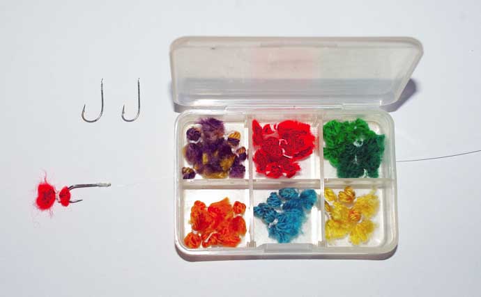 ミミイカ毛糸(提供:TSURINEWSライター丸山明)サビキ仕掛けには、6-8本ハリがありますが、そのうち1-2本にミミイカ毛糸をつけています。釣れると思っても100%の信頼でないいじらしさです。でも、そのハリ数の中から、紅い毛糸を喰って来れば、そう思わずにいられません。もしもと思われるならば簡単に作れますので、お試しください。