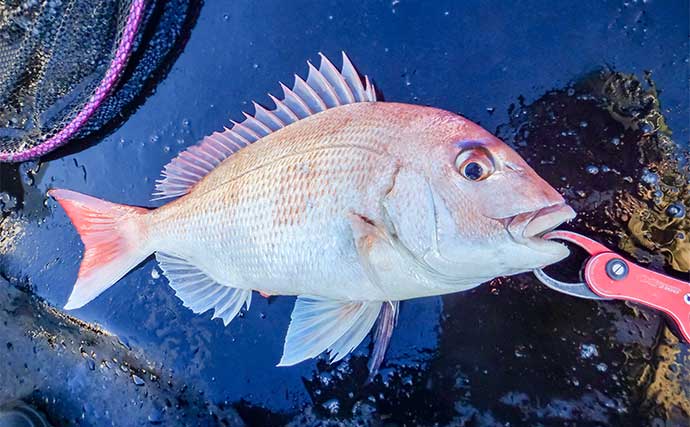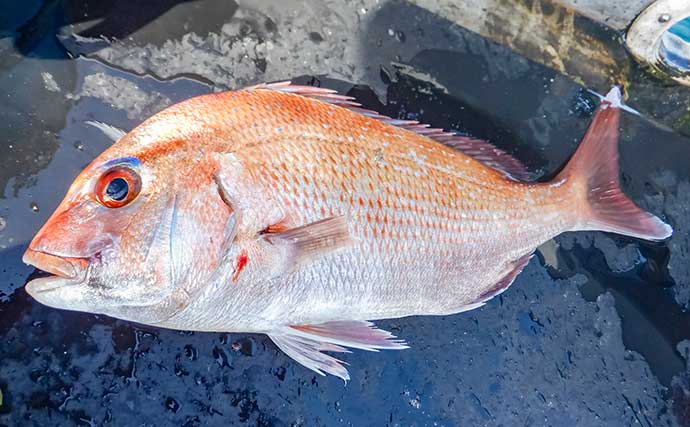 速い潮でもまれたマダイは味も姿も一級品(提供:週刊つりニュース中部版APC・原田順司)45cmの良型マダイ登場