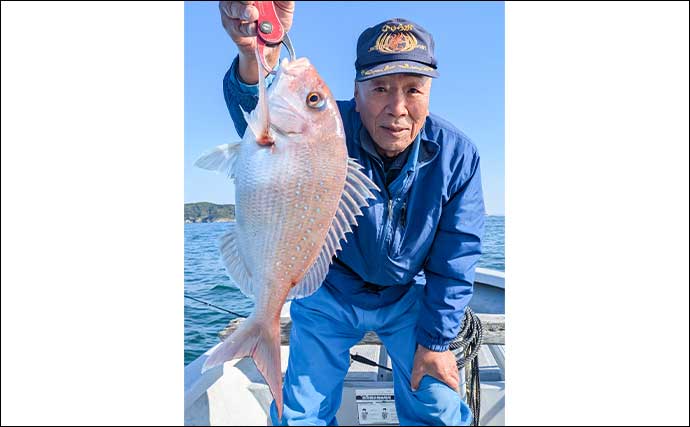片舷ドテラ流しが基本となる(提供:週刊つりニュース中部版APC・原田順司)35cmのマダイをキャッチ