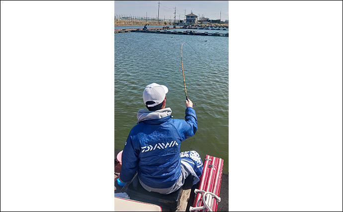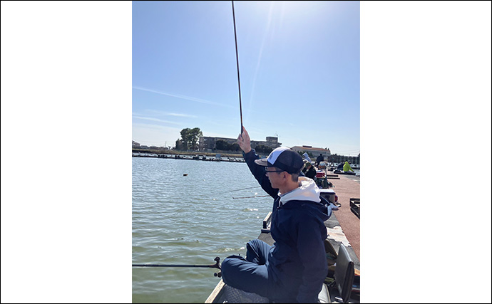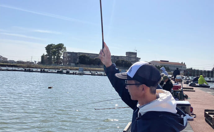 先に釣ったのは田邊さん。カチッとしたアタリでのヒット。最近の神扇池は回遊待ち傾向が強く、魚が回ってきたタイミングで確実にアタリを出して釣ることが、数を伸ばす秘訣だそうです。
