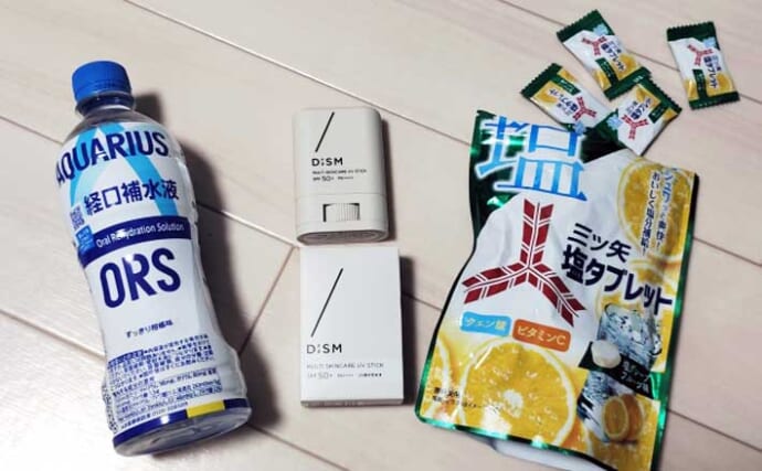 何をおいてもこれが基本となる。ミネラルを含んだお茶やスポーツドリンクを「やや多いかな?」と感じる程度用意しておきたい。万が一の為に塩分タブレットや経口補水液もあると安心だ。