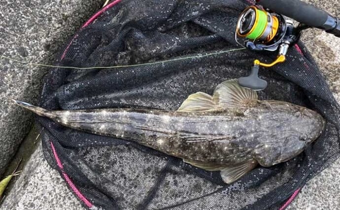 本命手中(提供:TSURINEWSライターかにおけ)現れたのは茶色と白の平たいボディ、良型マゴチの登場です。長い魚体に手こずりながらランディングに持ち込めば大きな口でバグアンツを丸飲み、フックが上顎を突き抜け迫力満点。暴れる本命に戸惑いながらフックを外し、写真を撮って早めにリリースします。釣果を得たことによりルアーマゴチ開幕と判断、良型ゲットに大満足です。