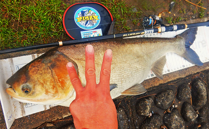 まずは1本目のハクレンをキャッチ(提供:TSURINEWSライター・なおぱぱ)奥山さんも尾びれのスレだったが、開始15分で筆者は本命をゲット。その後、奥山さんも本命を釣り、即座に2人とも坊主回避となった。