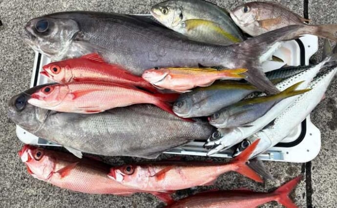 静岡県・御前崎港の輝風丸では、12日金洲五目で出船。潮は緩やかで釣りやすく金洲のポテンシャルを満喫。シマアジやウメイロ、メイチダイに加え、まさかのヒラマサまでヒット。ジギングではメダイやカンパチ、ヒラマサなどをキャッチ。6kg級のメダイも飛び出し、多彩な魚種でお土産は色とりどり。大満足の釣果となった。