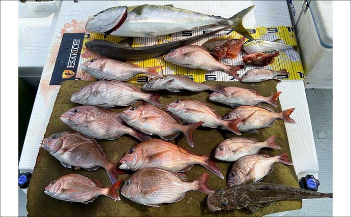 三重県伊勢市にある神社港出船の如意丸では、22日にタイラバで50cm頭に2人でマダイ7匹などの釣果。また、20日はマダイ30〜45cmが1人3〜6匹とのほか、ワラサやコチなど多彩な釣果に。この他、19日は親子で乗船した人が40cmアップのマダイをそろってゲットした。
