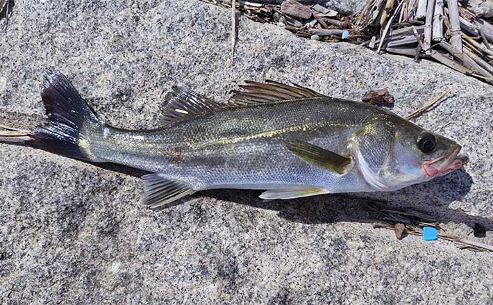 さっそくバイブレーションのリフトアンドフォールで釣ると、ゴン!と何かがヒット!かなりの重さだが、突然横に暴れ出した。強烈すぎる引きはコイかと思ったが、無事ランディングすると、74cmのシーバスであった。