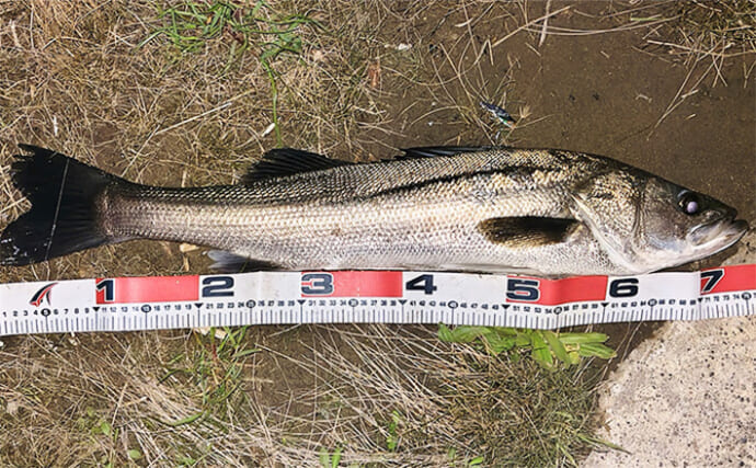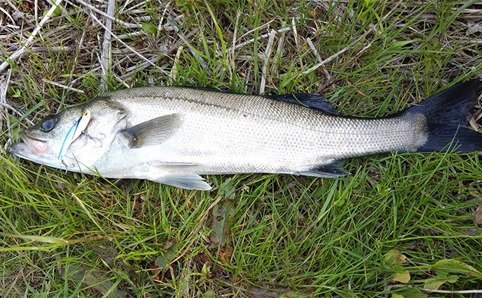 50cm級のシーバスをキャッチ(提供:TSURINEWSライター・宮坂剛志)その後、排水溝の流れに乗せて巻いてくると、すぐにアタリがあり、同じようなサイズを連続キャッチ。暗くなり始めると、なぜか食わなくなったのでいつもの中流域へ戻ることにした。