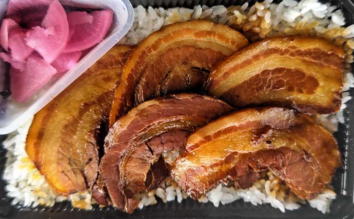 チャーシュー丼(提供:週刊つりニュース関東版APC・澤田朝寛)釣行帰りは、近くにある、としまやの「チャーシュー弁当」がお勧め。秘伝のタレを使った伝統の味で、とても美味しい。