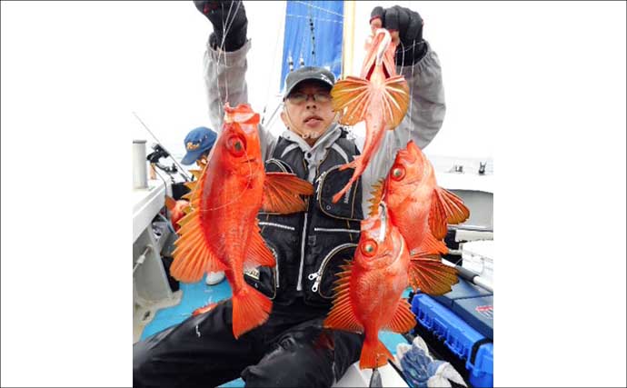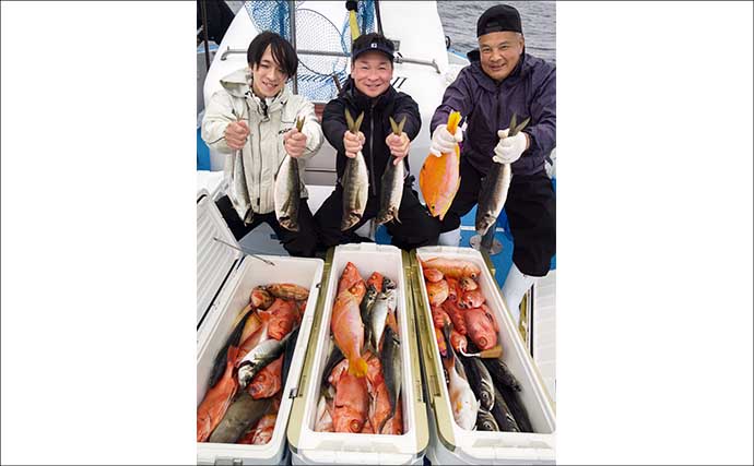 4月20日、福岡県宗像市大島の第二宮一丸がテンビン五目釣りで玄界灘へ出船。この日はアカイサキ、チカメキントキ、沖メバル、レンコ、バカアジ(大アジ)、タカバなど多彩な釣果が上がった。船長は「日によってムラがあります」と話している。