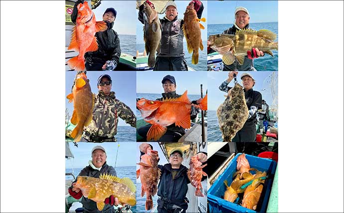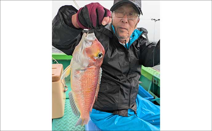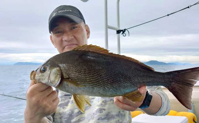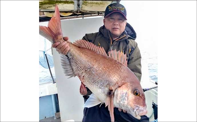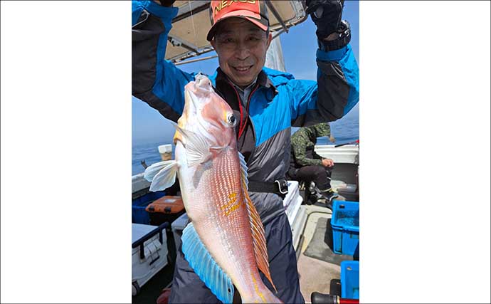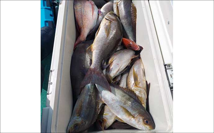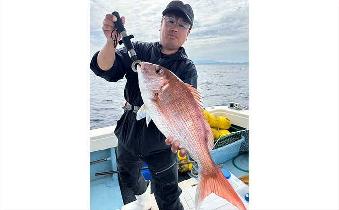 4月20日、福岡県宗像市・大島の明石丸が玄界灘のテンビン五目釣りに出船すると、船中ではマダイ5kg頭に数ヒットしたほか、クロ1~3kg、イサキ25~37cm、アカイサキ25~40cmなど交え好土産ができた。今後も多彩な釣果が望めそうだ。