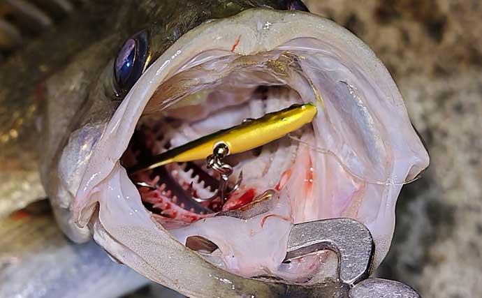 丸呑みだ(提供:TSURINEWSライター宮坂剛志)また、ロッド(竿)を上下に大きくあおって釣る、リフトアンドフォールという釣り方も悪くない。つまり、自分なりのオリジナルの釣り方が釣果を上げるコツでもある。特にデイゲームは単調な釣りになりがちなので、素早く巻く以外に色々試してみるのも面白い。