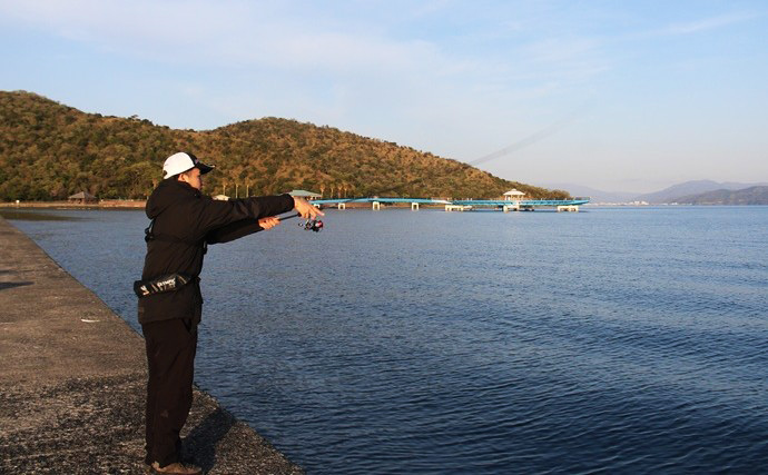 奥戸さんは堤防左側に入り、まずはジグ単で敷石群の上スレスレを通していく。潮があまりに澄んでいるため、メバルも根魚もオープンな場所には出てきそうにない。ゆえに、ボトム狙いに徹する戦術を採った。