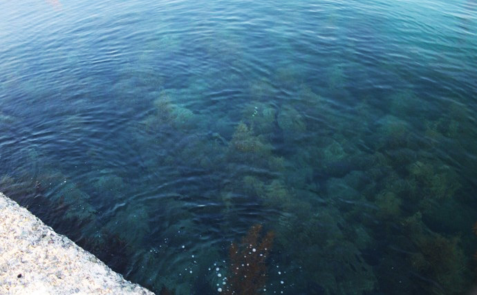 まずは水深のある沖堤防へ(提供:週刊つりニュース中部版編集部・五井)堤防に着くと、非常に潮が澄んでおり、海中の様子は丸見え。魚を釣るにはタフな条件だが、海底の状況が手に取るようにわかった。水深は足元で3〜6mほど。沖に向かって堤防の右側は深く、左側は浅い。堤防の基礎を形成する敷石群は数m先まで入り、スロープ状に深くなっていた。