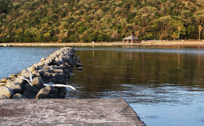 堤防左端の水深は足元で5〜6m、敷石の先はさらに深い。水深があるぶん攻めにくいものの、ベイトの姿も確認でき、期待が持てそうな雰囲気だ。