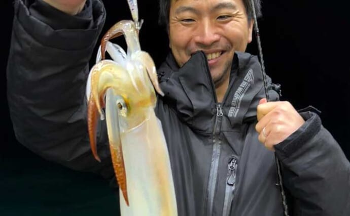 宗像市鐘崎港から出船中の第三八幡丸は玄界灘で夜イカ釣り。ヤリイカは30尾、スルメイカは100尾と順調、良型も交え数釣る人も。