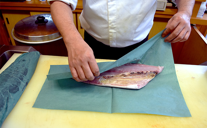 魚を包んでいく(提供:週刊つりニュース中部版編集部・牧田)ぴったりと貼り付くので包みやすい。
