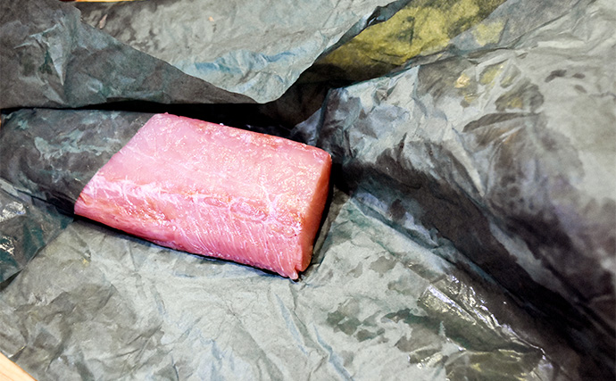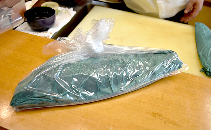 この状態で冷蔵庫へ(提供:週刊つりニュース中部版編集部・牧田)短期保存で調理する場合、グリーンパーチで包む前に皮面を下にして、身全体に軽く塩を振って1〜2時間放置する。しみ出たドリップをしっかり拭き取り、食べたいサイズだけ切り出して、残りはグリーンパーチで包む。ビニールに入れ、空気に直接触れないよう空気を抜いて保存する。