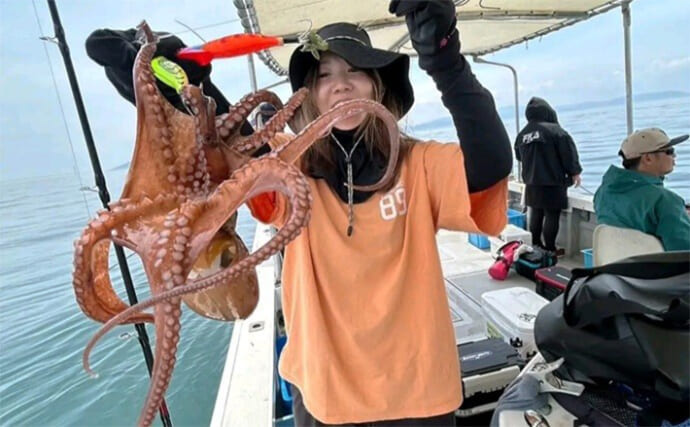 その後のマダコ釣りは絶好調で、サオ頭は20匹超の釣果となった。なお、同船はマダイとマダコのリレー釣りのほか、釣期に入れば大型アジとマダコを狙った便も出船予定。
