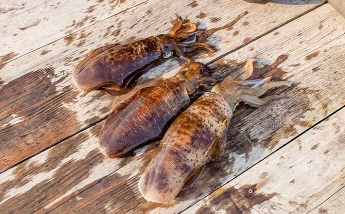 3匹の良型アオリイカをキャッチ(提供:週刊つりニュース中部版APC・山根充伸)ここ迫間浦の宝成渡船では、連日アオリイカの釣果が出ている。2日後にはエギングで2.8kgのモンスターサイズも上がっている。陸っぱりで釣り場を模索している人や場所取りで悩んでいる人は、イカダからのんびりゆったり楽しんでみてはいかがだろう。