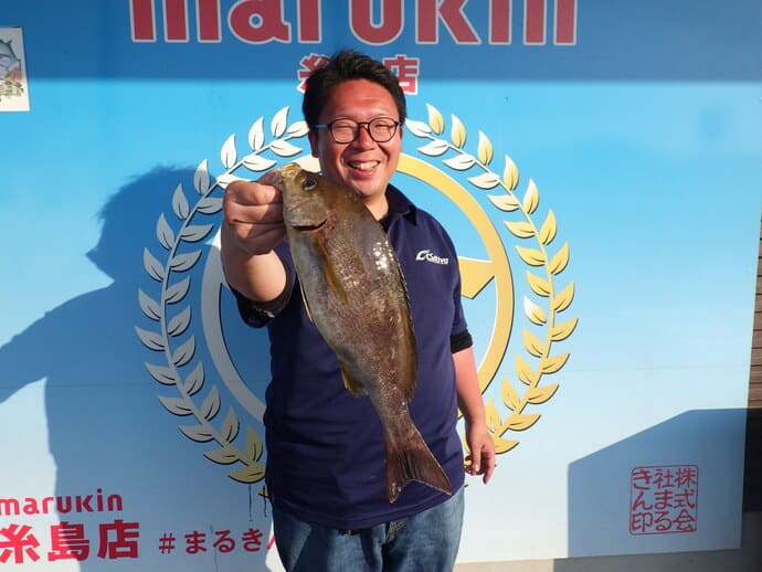 まるきん糸島店スタッフ・深川さん(提供:株式会社まるきん)つり具のまるきん福岡糸島店スタッフの深川さんがSLJで良型のイサキを釣り上げた。遊漁船は佐賀県唐津市肥前町大浦浜の遊漁船SUN。