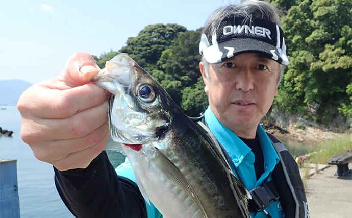 釣り始めから2時間が過ぎたころ、ようやくつけエサが取られ始めた。そこでフカセ釣りに戻すと、サオ引きのアタリが出た。小気味いい引きを見せたのは25cmほどのアジだ。