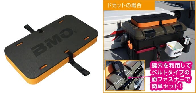 ビーエムオージャパンの3WAYクッション(提供:株式会社 ビーエムオージャパン)主にオフショアゲームや沖釣り用のタックルボックスとして、多くの人に愛用されているドカット。船の移動中などに腰掛として利用している人も多い。そんなユーザーがより快適に座れるために誕生したのが、ビーエムオージャパンの3WAYクッション。