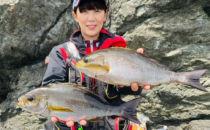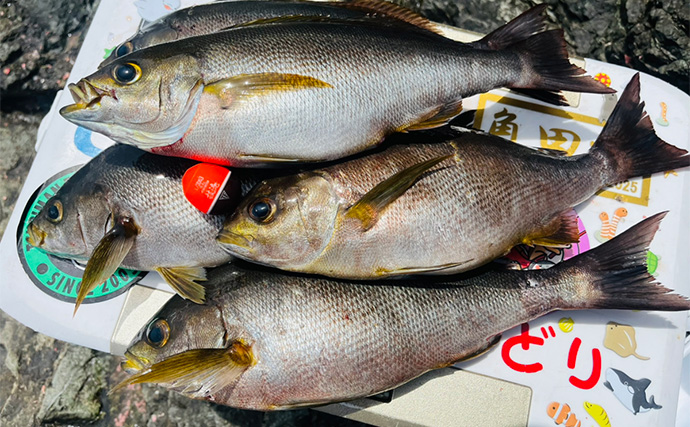 イサキが入れ食いに(提供:TSURINEWSライター・藤本みどり)少し食い気が落ちてきても、ポツリポツリをは釣れてくれました。遠投をした方が良型のイサキが多かったです。私が使用している集魚剤(釣まん・グレナビ)は遠投がしやすいのでおすすめです。