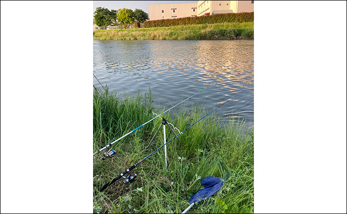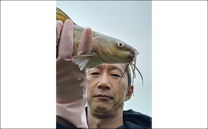 アメリカナマズが釣れる(提供:TSURINEWSライター・岩浅健太郎)写真撮影していると違う竿の鈴が鳴り今度は鯉ゲット!そして間髪入れず鈴が鳴りマブナをキャッチ。