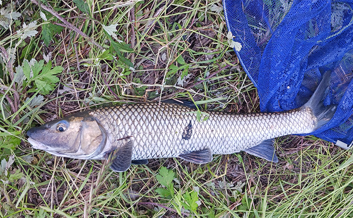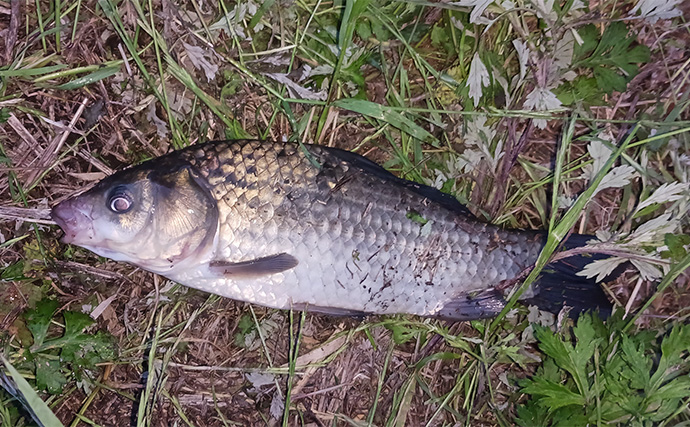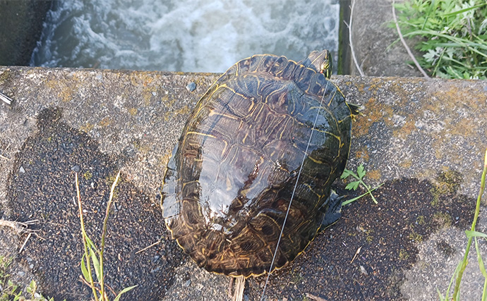 カメがヒット(提供:TSURINEWSライター・岩浅健太郎)一服後入れ直すと直ぐに激しく鈴が鳴り竿を上げるとドラグが出て鯉だと確信しました。しかし釣れたのは50cmのニゴイ。