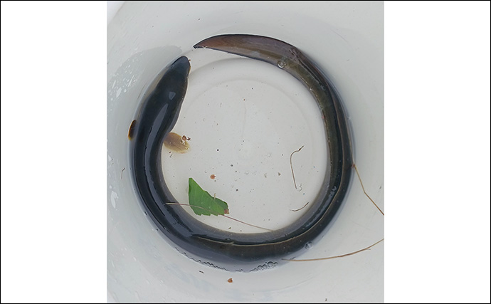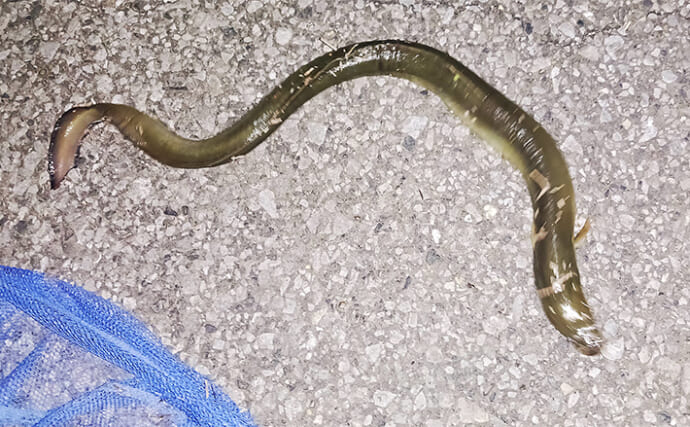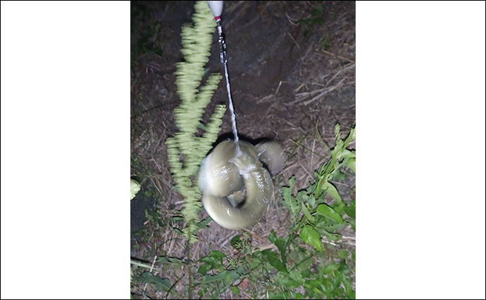 トグロを巻いたウナギ(提供:TSURINEWSライター・岩浅健太郎)ぶっこ抜くと本命ウナギ!指1本半の太さでした。これからの時期ウナギ最盛期を迎えます。夜な夜な狙ってみると素敵なゲストも釣れて楽しいと思います。ぜひ狙ってみてください。