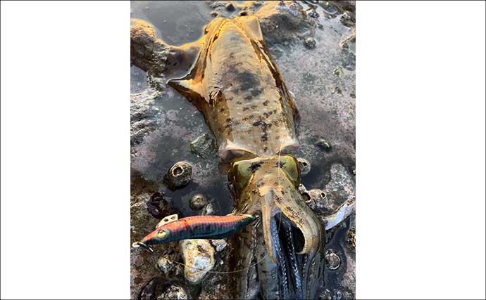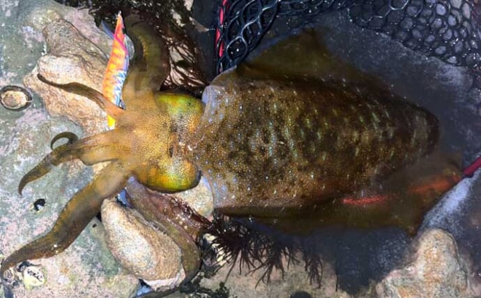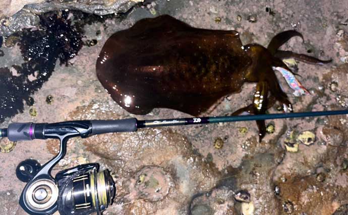 福岡エリアの遊漁船の釣果を見ていると、2025年の春アオリイカはそれなりに好調な様子。そこで、5月26日に地磯へエギング釣行に出かけた。エギのローテが的中し、1.2kgのアオリイカをキャッチした模様をレポートしよう。