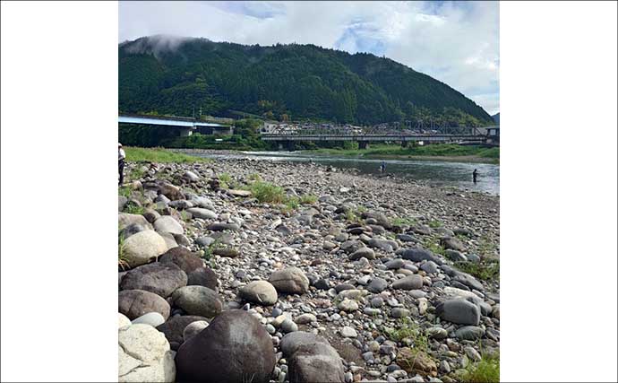 右岸は通称新淵で、ここも終盤アユがたまる鉄板ポイント。左岸は釣りやすい瀬が続く。ここは左岸からもアプローチ可能。オモリや背バリを駆使して、オトリを止めて待つとよく釣れる印象だ。