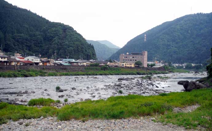 東海北陸自動車道の郡上八幡を下車してすぐのポイントだ。広い瀬が広がる。初期は意外に釣れないが、梅雨明けから徐々に調子が上がる。特に高水からの引き水時は入れ掛かりになる。