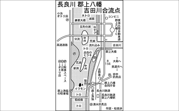 ポイント略図(提供:週刊つりニュース関東版APC・松森渉)しかし、その後は場所ムラはあるものの、釣果は上がっていたように思えた。梅雨の時期は、毎年のように中だるみ状態でパッとしなかった。梅雨明けからは回復し、終盤まで楽しめた。ただ、終盤になっても小ぶりのアユが多かった印象が強い。天然遡上が多すぎたせいかもしれない。