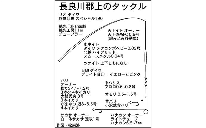 トモ釣りのタックル(提供:週刊つりニュース関東版APC・松森渉)今回紹介するのは、毎年梅雨明けから終盤まで好釣果が出ている郡上八幡の勝更大橋から組合前までを解説したい。