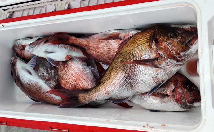 福井県・鷹巣漁の天栄丸では、29日滋賀県の3人が午前便で出船、鷹巣沖でマダイ3匹、ヒラマサ65cmにイサキやウマヅラゲット。また午後の別船はマダイが高活性で、三重県の3人はクーラー満タンの釣果。