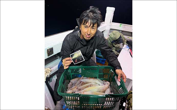 福井県小浜市西津の直幸丸では、連日スルメイカオールナイト便は千匹オーバーの大漁だ。28日は1人60〜182匹、船中1225匹と今季最大の爆釣劇。29日も船中1155匹、サオ頭200匹と好調で、3ケタオーバー続出。イカをエサにして良型マダイも11匹仕留められた。